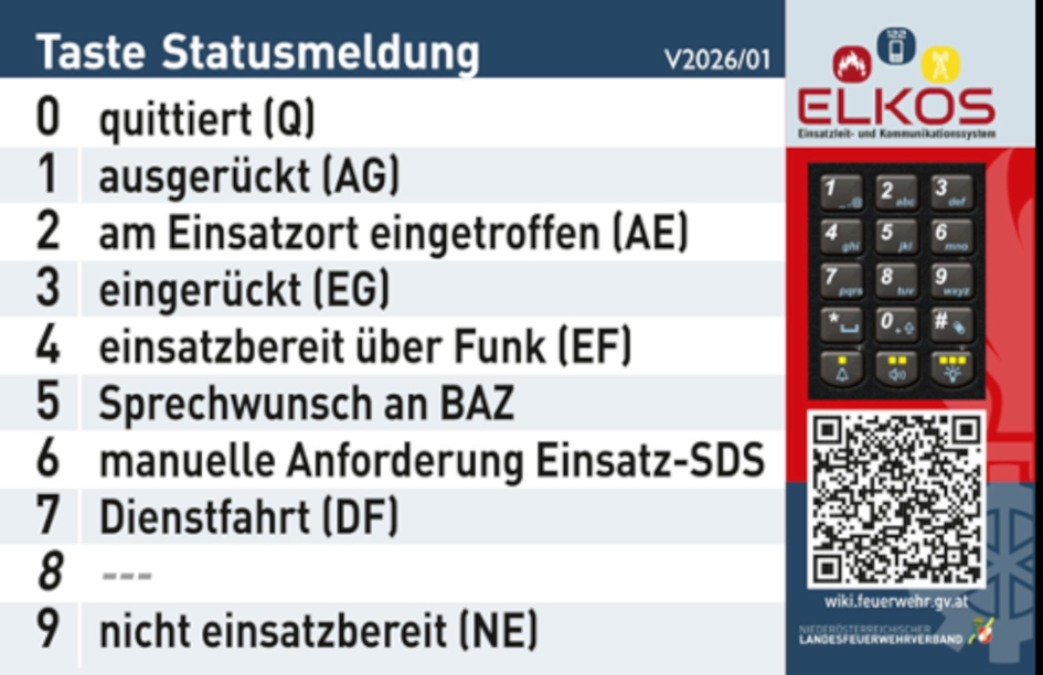 Die Disponenten der Bereichsalarmzentrale (BAZ) Amstetten bitten darum, die angeführten Statusmeldungen im Einsatz- und Übungsdienst konsequent anzuwenden. 0 – Quittiert (Q)Einsatz von BAZ erhalten, ausrücken erfolgt in Kürze oder Abklärung zum Einsatz läuft noch.Bestätigung der...