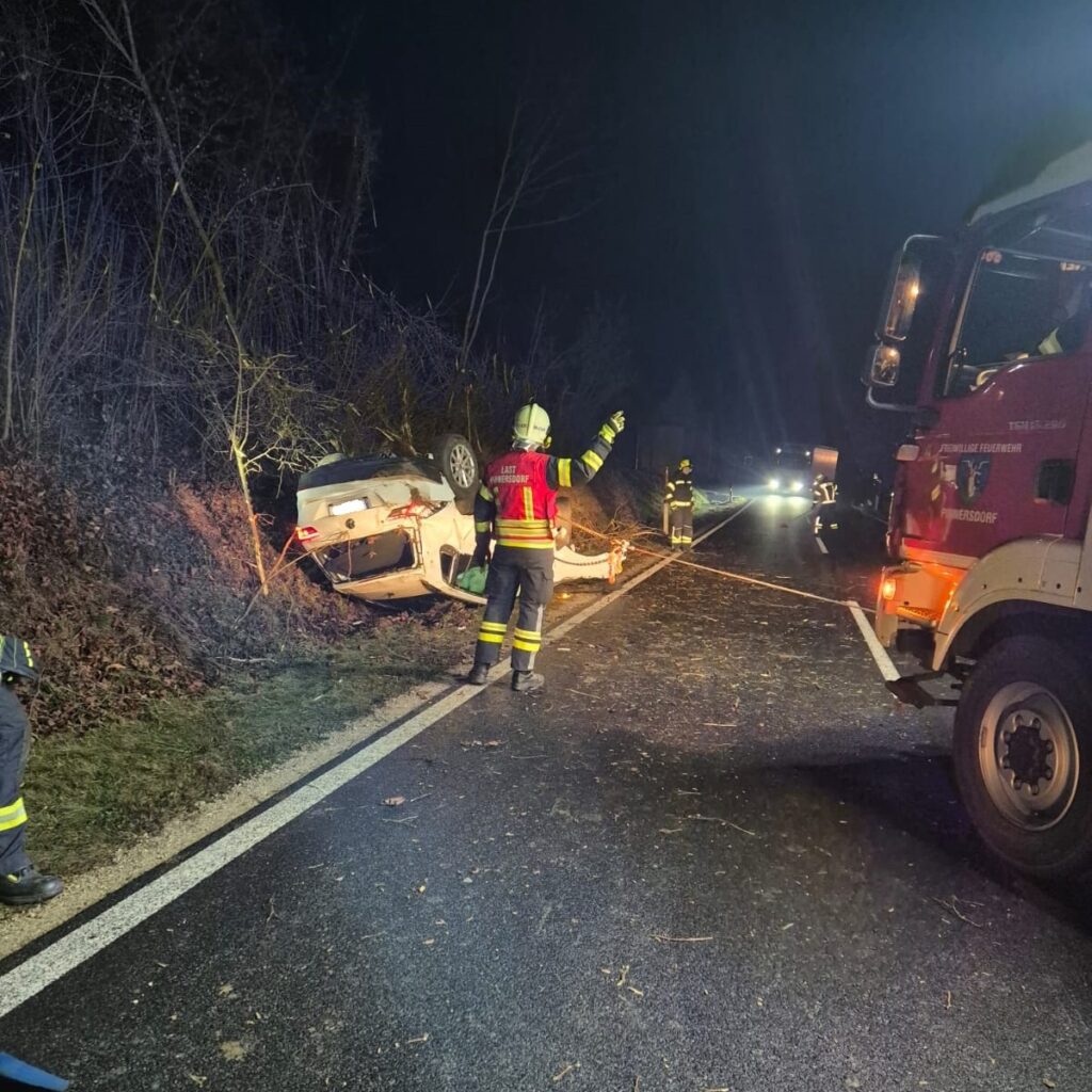 In der Nacht auf den 2. Dezember wurde die FF Pinnersdorf zu einer Fahrzeugbergung alarmiert. Ein Pkw hatte sich überschlagen und kam auf dem Dach zum Liegen. Beim Eintreffen wurde der Lenker bereits von der Rettung versorgt und mit Verletzungen unbestimmten Grades ins Krankenhaus gebracht.