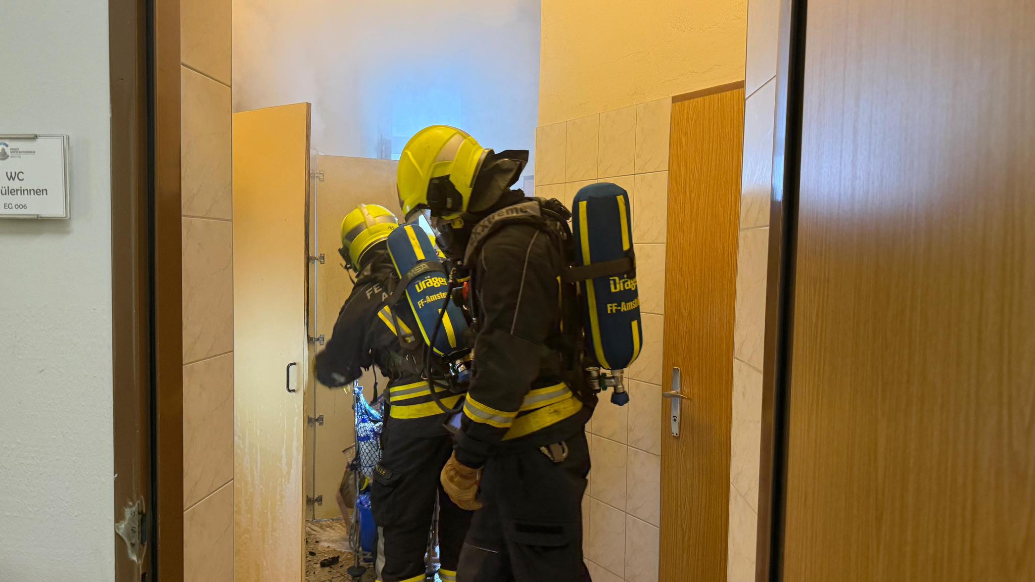 Der Schrank, der Putzmittel, Fetzen und WC-Papier enthielt, wurde vom Feuer zerstört und die Reste von den Florianis aus dem Gebäude gebracht. Der Schaden dürfte sich insgesamt in Grenzen halten.