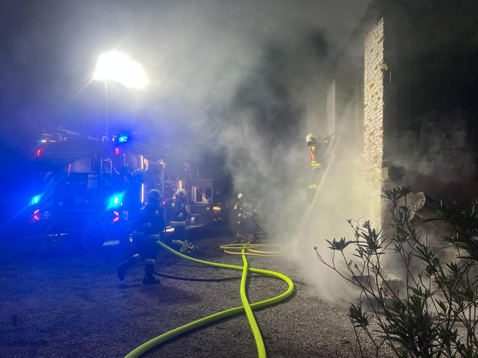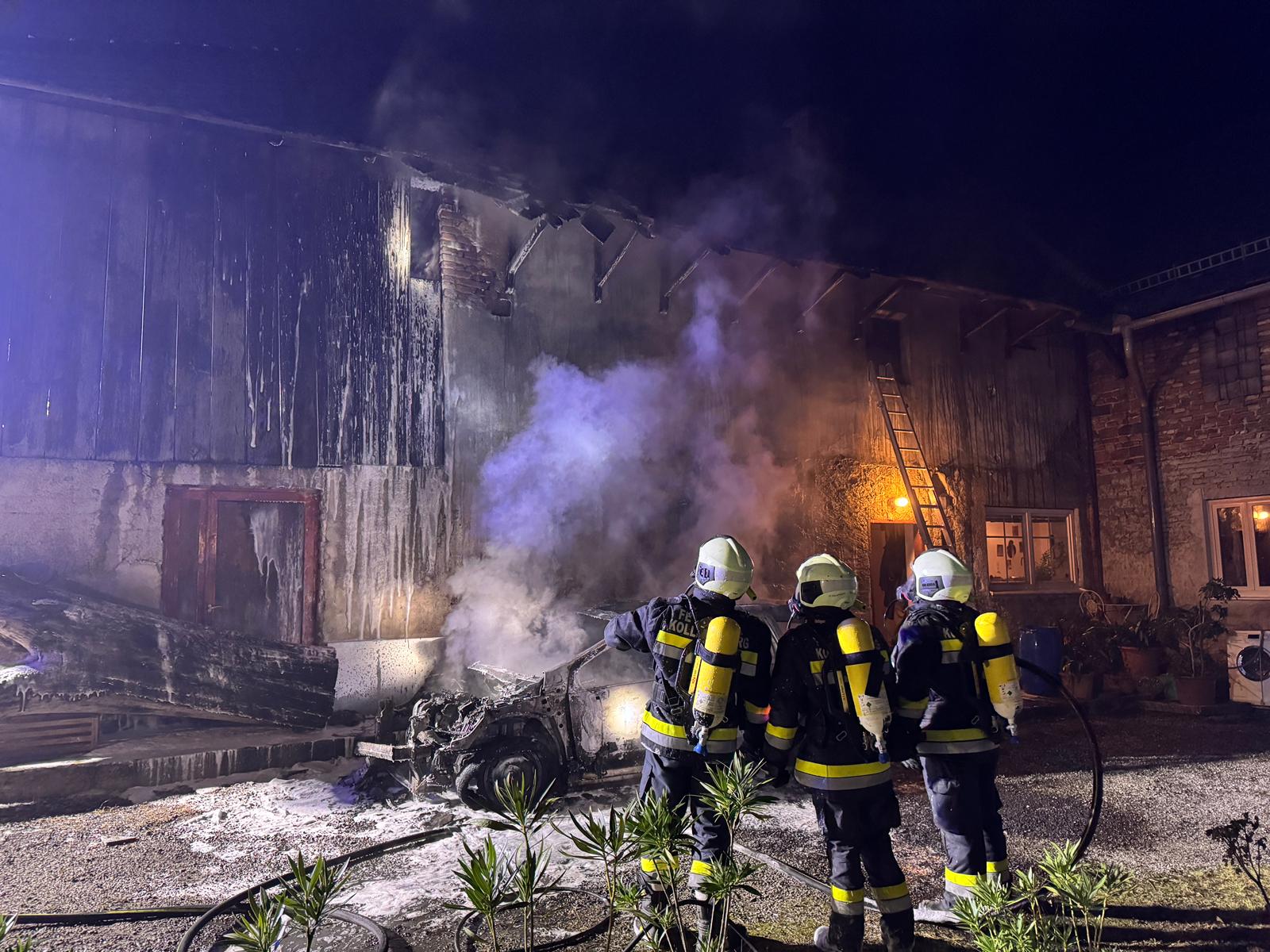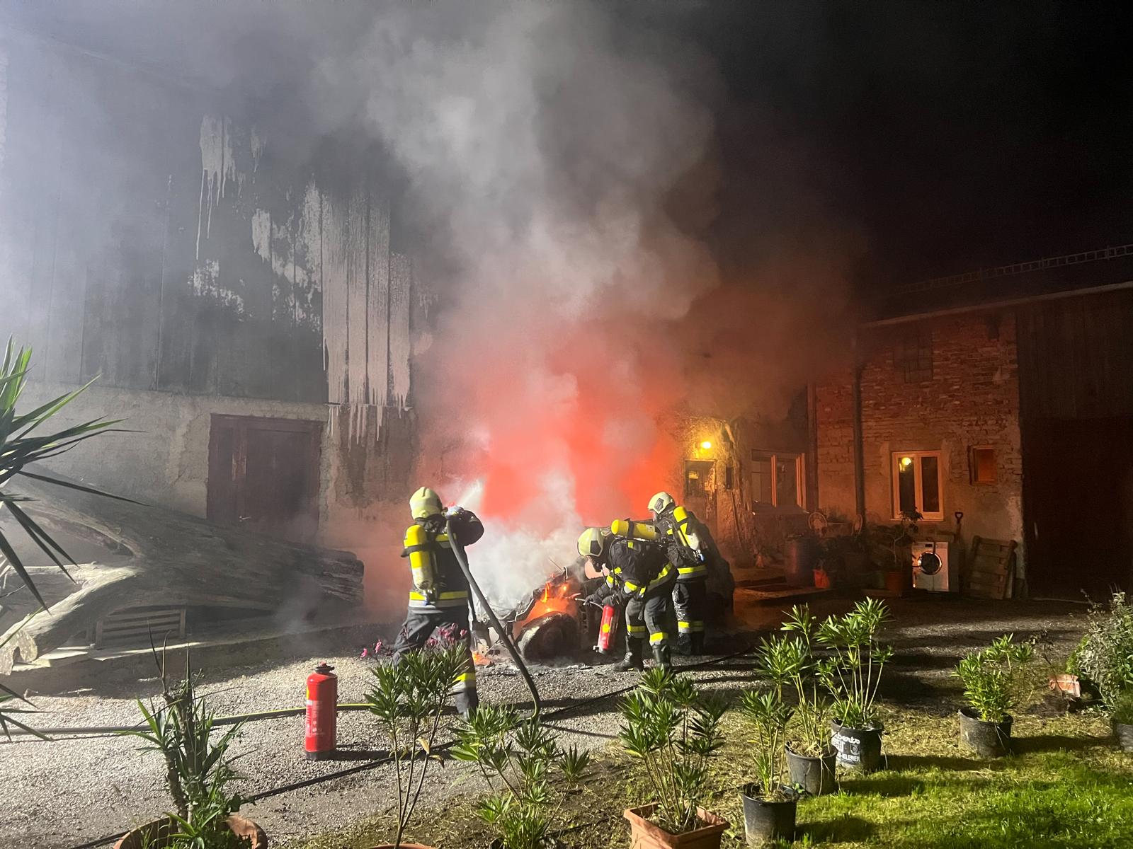 Die Einsatzkräfte kamen rechtzeitig, um ein weiteres Ausbreiten des Brandes zu verhindern. Dieser ging von einem brennenden Fahrzeug auf ein Wohngebäude über, konnte aber rasch gelöscht werden. Dazu verwendeten die insgesamt 110 Feuerwehrmitglieder CAFS-Schaum, Atemschutz und mehrere Löschleitungen. Eine Decke ist zwar eingestürzt, verletzt wurde aber niemand. Gegen 23 Uhr konnte „Brand Aus“ gegeben werden.
