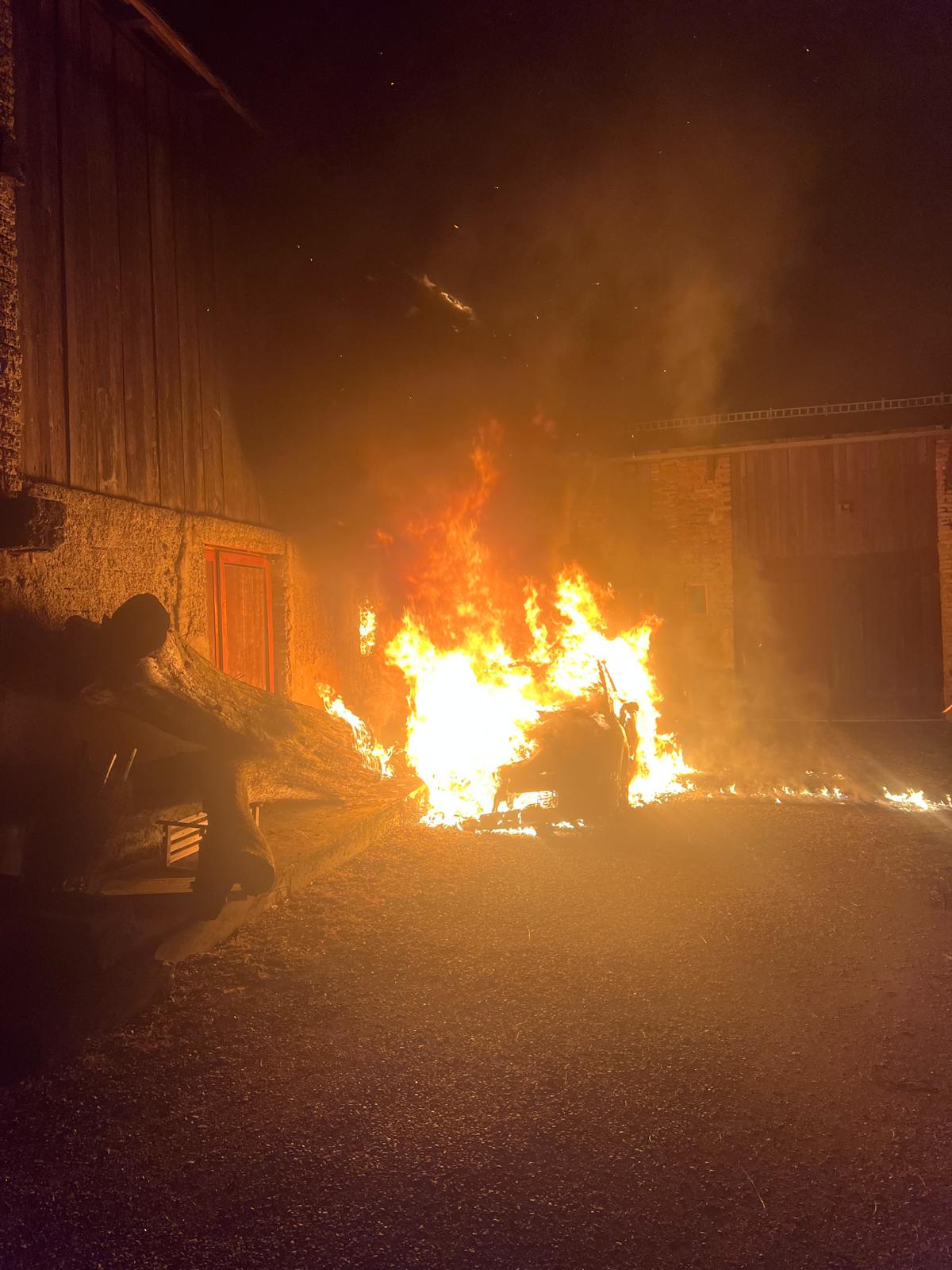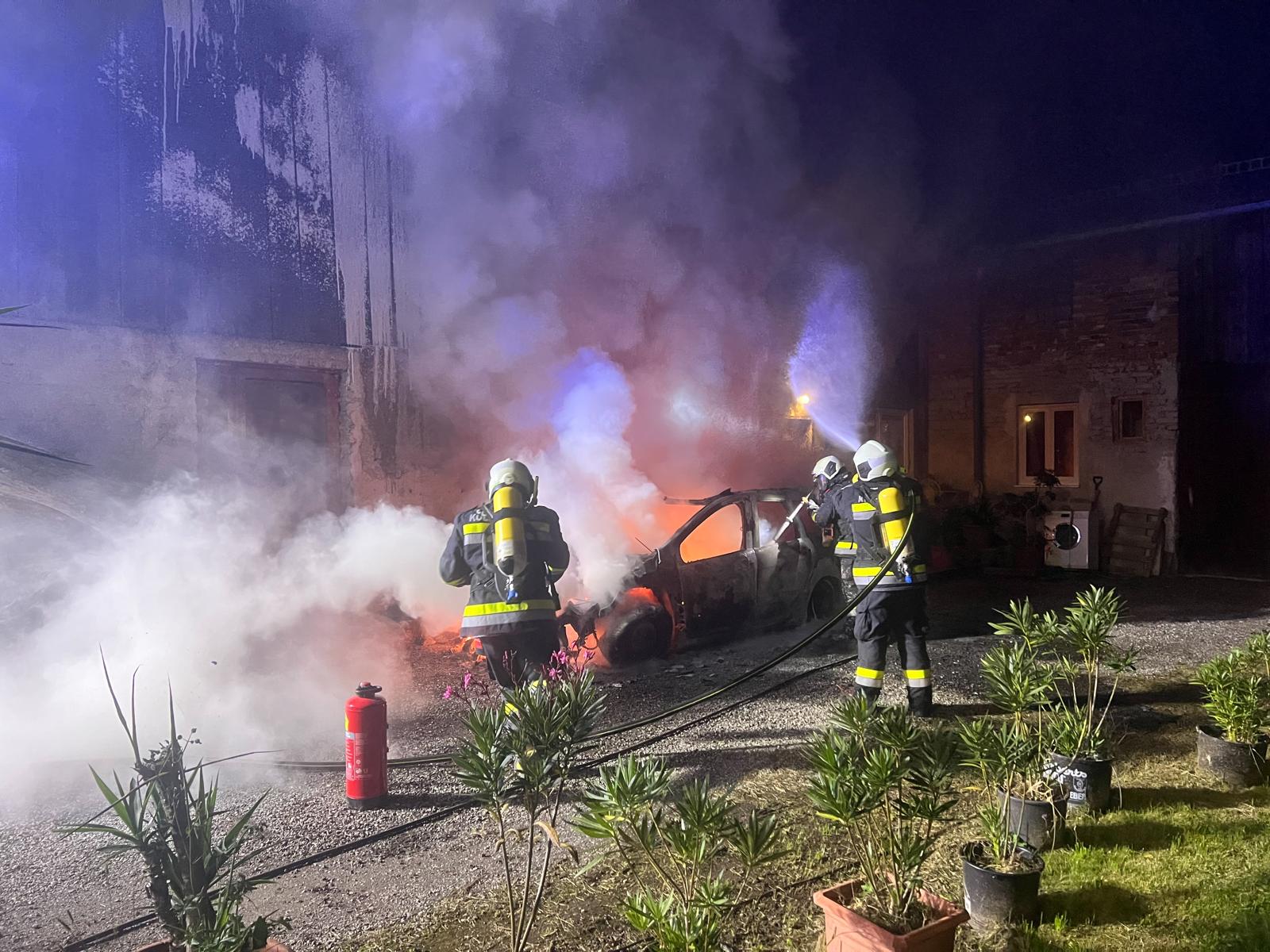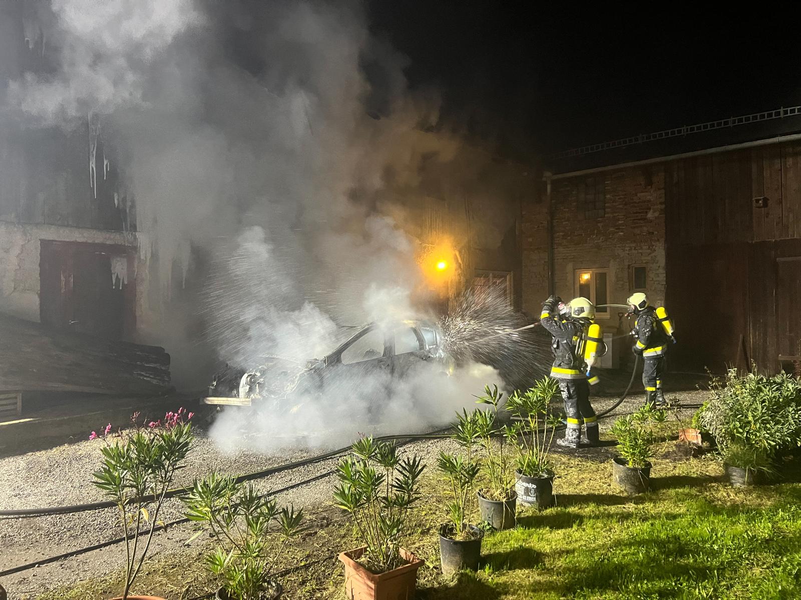 Die Einsatzkräfte kamen rechtzeitig, um ein weiteres Ausbreiten des Brandes zu verhindern. Dieser ging von einem brennenden Fahrzeug auf ein Wohngebäude über, konnte aber rasch gelöscht werden. Dazu verwendeten die insgesamt 110 Feuerwehrmitglieder CAFS-Schaum, Atemschutz und mehrere Löschleitungen. Eine Decke ist zwar eingestürzt, verletzt wurde aber niemand. Gegen 23 Uhr konnte „Brand Aus“ gegeben werden.