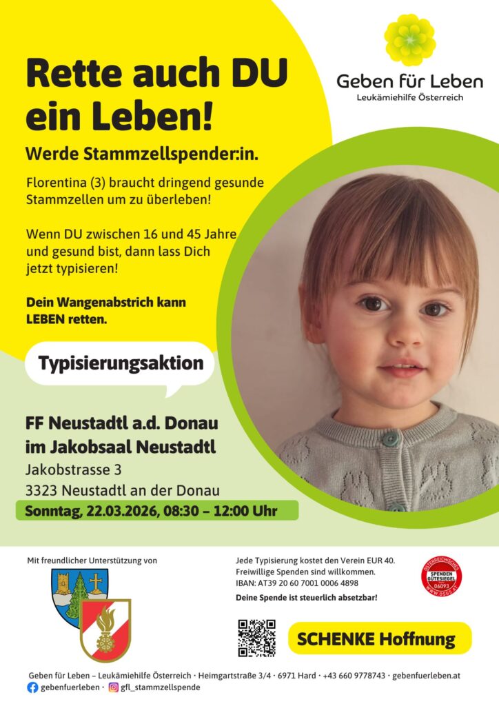 Für die 3-jährige Florentina werden dringend passende Stammzellspender gesucht. Jede einzelne Typisierung kann Leben retten. Gerade die Feuerwehrkameradinnen und -kameraden im Alter zwischen 16 und 45 Jahren könnten hier einen entscheidenden Beitrag leisten.