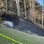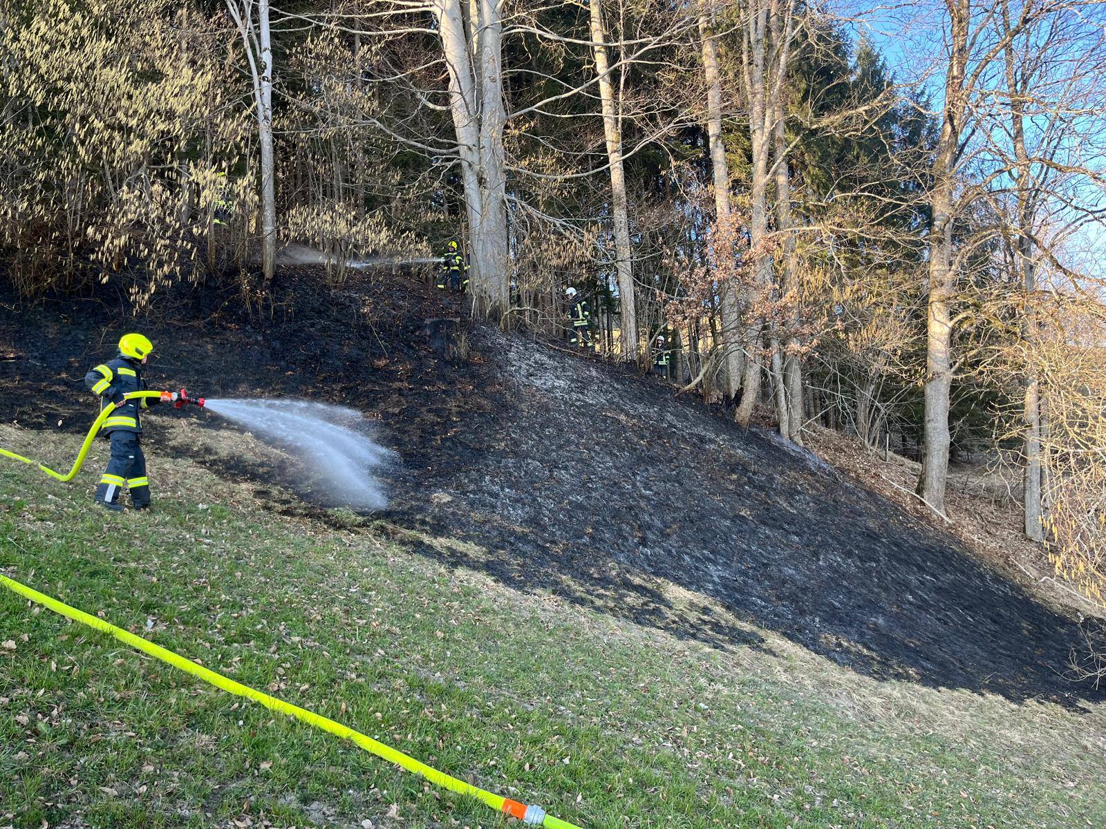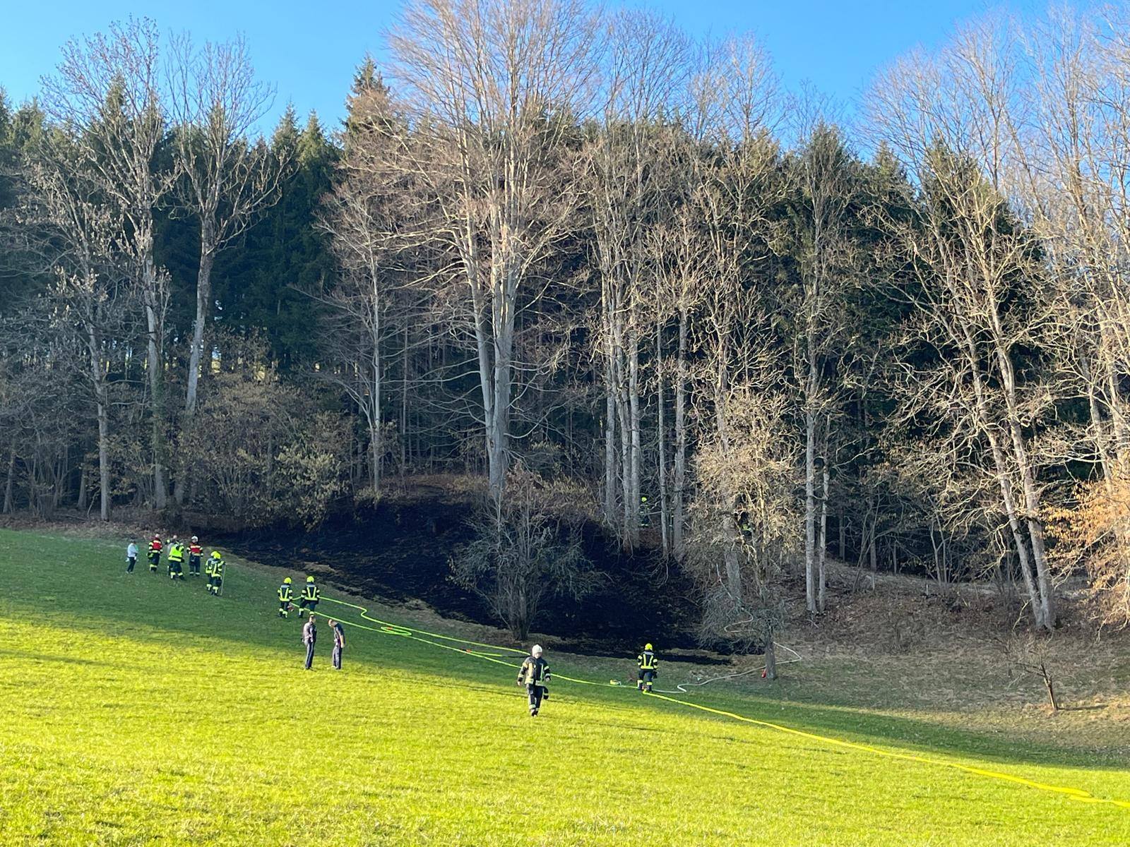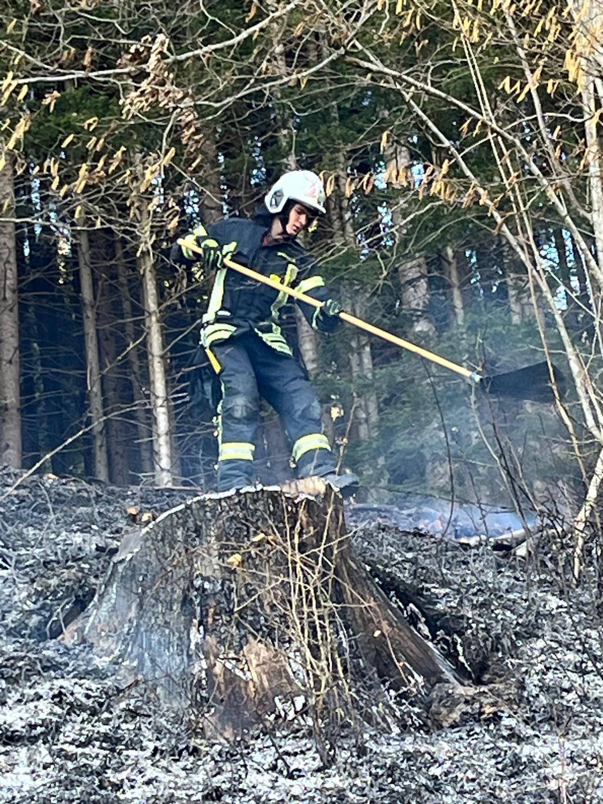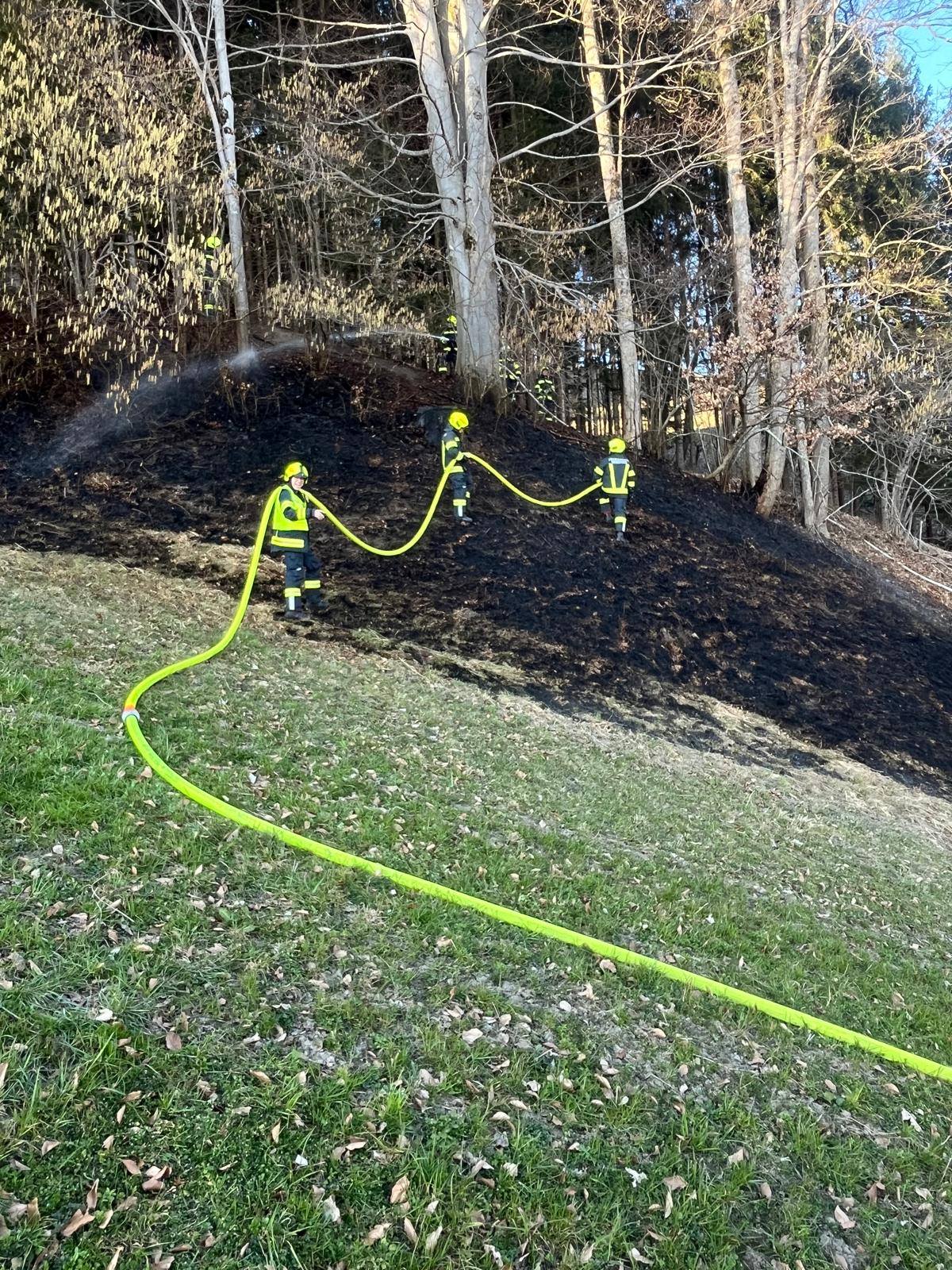 Beim Eintreffen der Einsatzkräfte hatte sich das Feuer bereits auf den angrenzenden Waldboden ausgedehnt. Durch das rasche und koordinierte Eingreifen der drei Feuerwehren konnte der Brand jedoch schnell unter Kontrolle gebracht werden. Mit mehreren Löschleitungen löschten die Feuerwehrleute die Brandstellen und lockerten danach den Boden, um versteckte Glutnester freizulegen. Abschließend wurde noch die gesamte Fläche mit der Wärmebildkamera kontrolliert, um versteckte Glutnester aufzuspüren und zu löschen. Nach etwa einer Stunde war der Einsatz zu Ende.